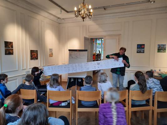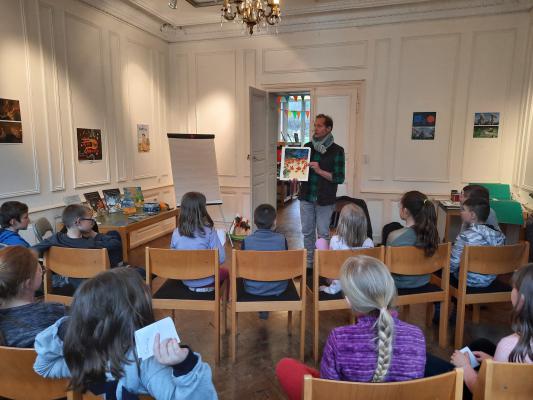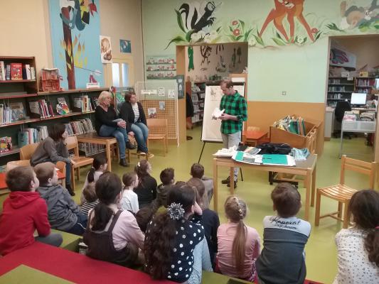 Jeudi après-midi, une classe de de l'école Perrin Sand à Senones a rencontré ce même illustrateur. Les enfants avaient apporté des dessins en cadeau mais aussi une boite à questions. Christian Heinrich leur a raconté son parcours d'illustrateur, et fait une belle présentation de ses albums et personnages.