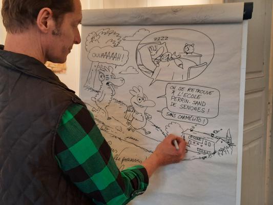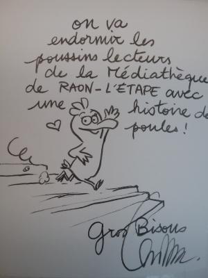 Dans les médiathèques du réseau Escales, ce sont 4 classes qui ont profité de la venue d’une personnalité. Jeudi 7 matin, à Raon l’Étape, deux classes de CE2-CM1 ont rencontré l’illustrateur Christian Heinrich. Ils ont pu échanger avec lui sur son travail : l’illustration des albums de la série Les p’tites poules. Les enfants ont eu la chance de repartir avec un dessin du jour spécial pour leur classe.